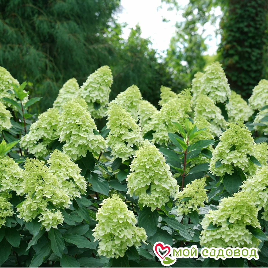 соцветия большие 30-35 см, плотные, при распускании цветов зеленоватые, потом их окраска меняется на лаймово-белую, а ближе к осени возможно добавление розоватых оттенков;